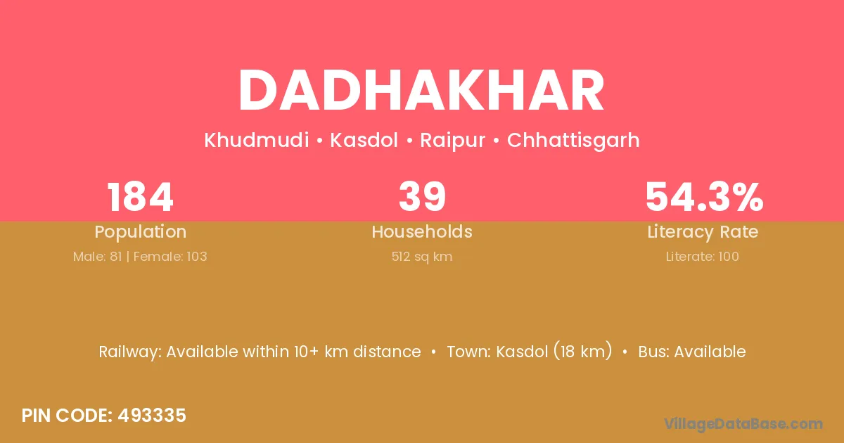 Kasdol (18 km) is the nearest town to Dadhakhar village for major economic activities and is located approximately 18 km away.