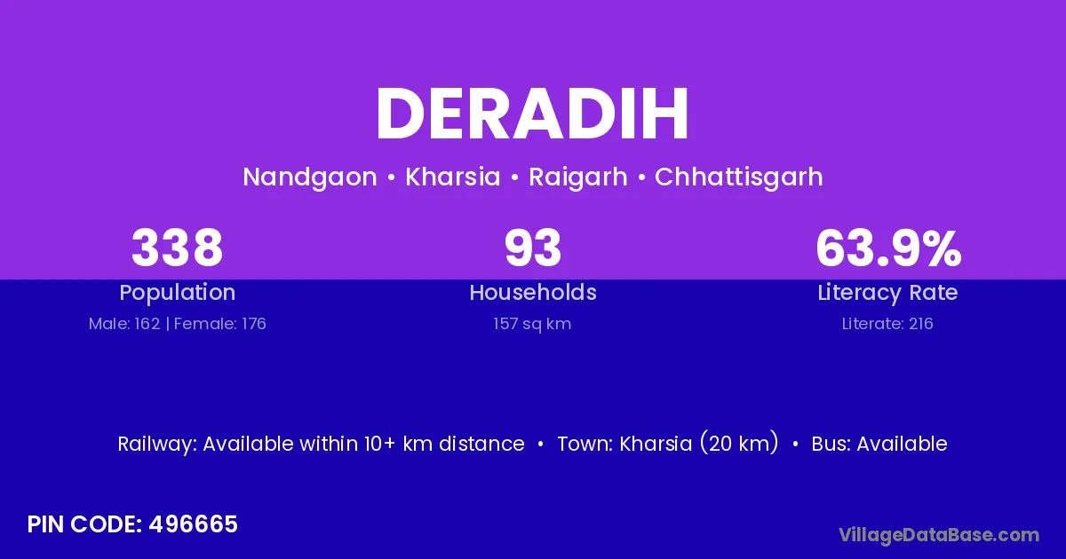 Kasdol (15 km) is the nearest town to Deradih village for major economic activities and is located approximately 15 km away.