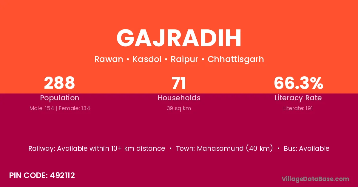 Mahasamund (40 km) is the nearest town to Gajradih village for major economic activities and is located approximately 40 km away.