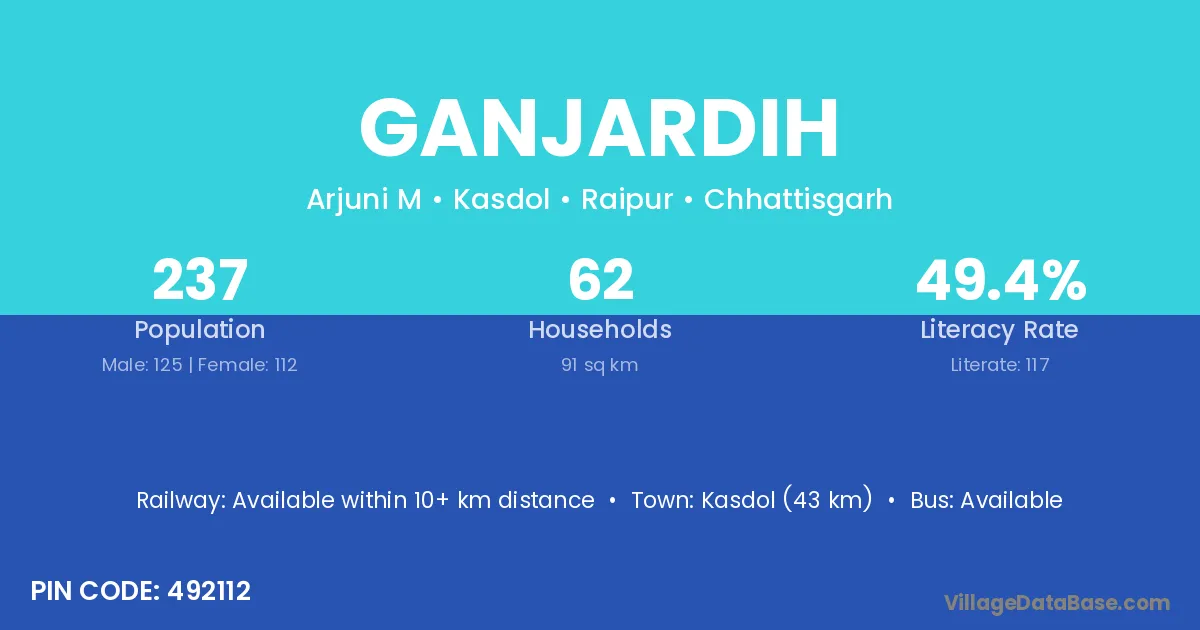 Kasdol (43 km) is the nearest town to Ganjardih village for major economic activities and is located approximately 43 km away.