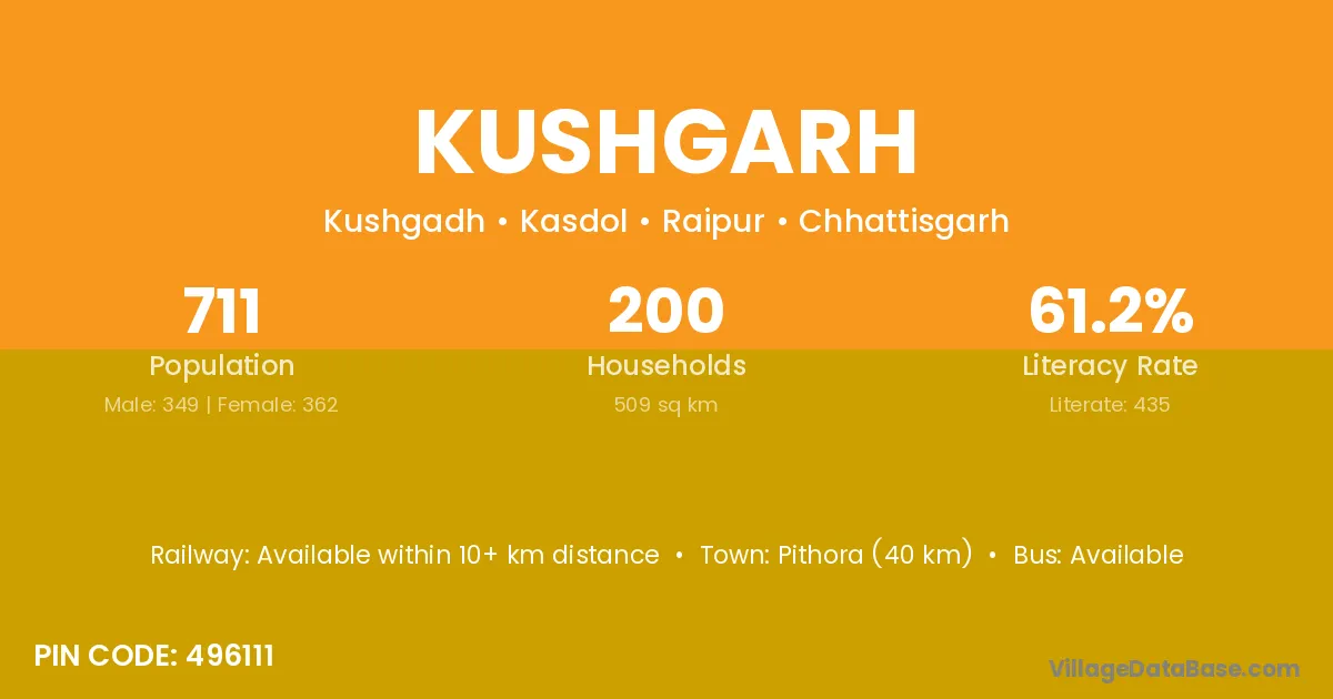 According to Census 2011 information, the village code of Kushgarh village is 496111.