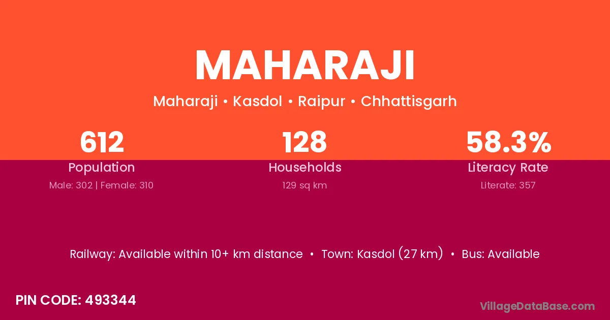 Maharaji village has a total population of 612 people, of which 302 are males and 310 are females.