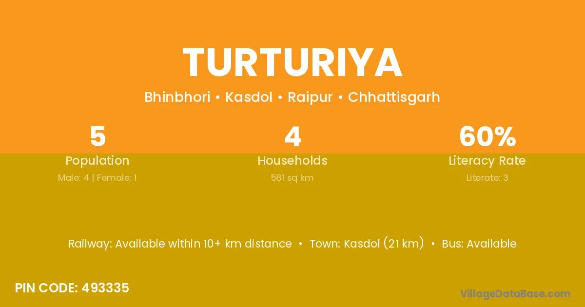 Kasdol (21 km) is the nearest town to Turturiya village for major economic activities and is located approximately 21 km away.