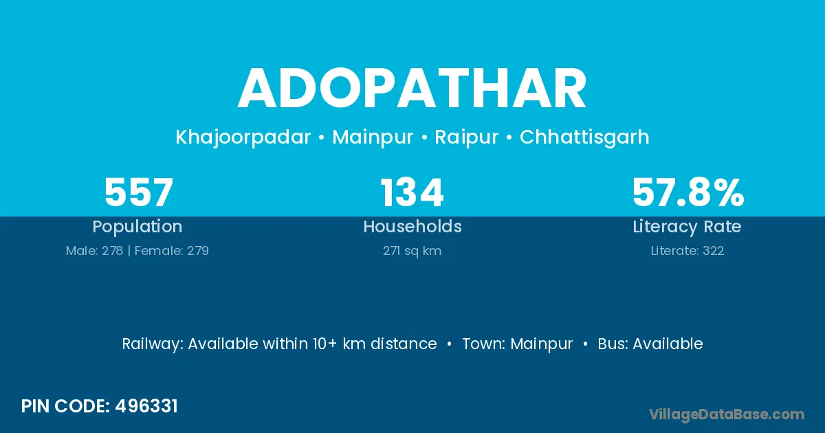 Adopathar village has a total population of 557 people, of which 278 are males and 279 are females.