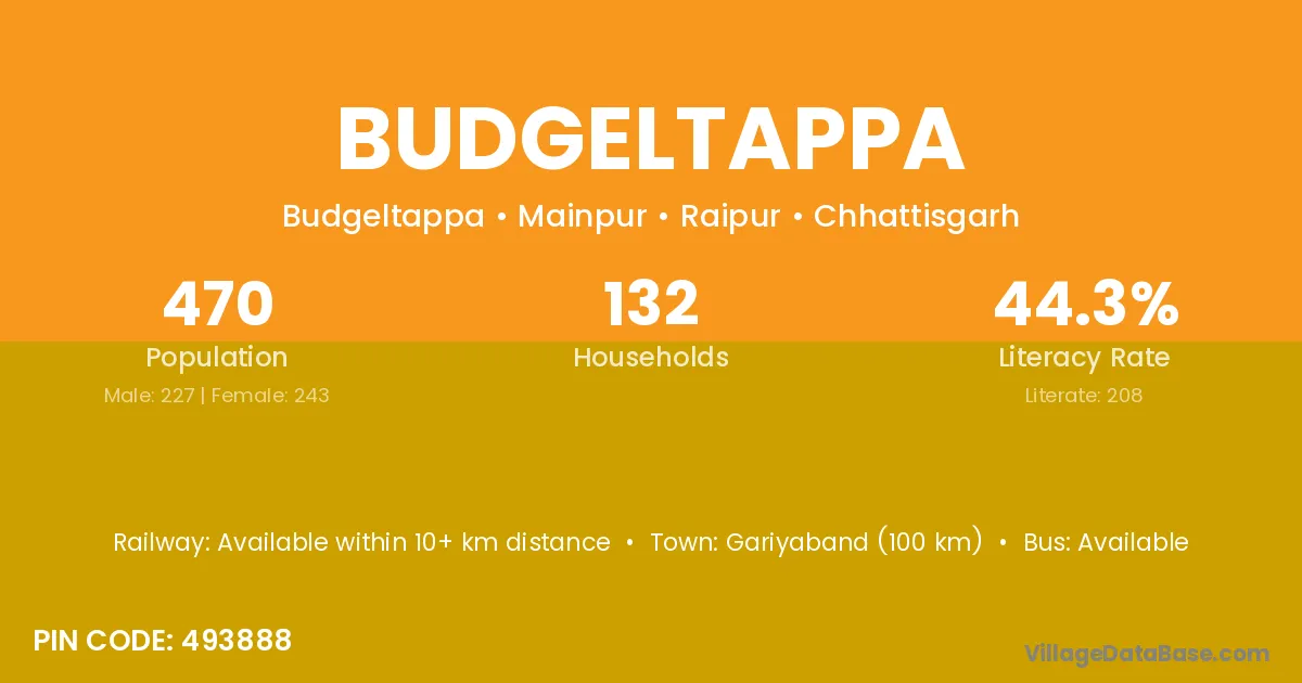 Gariyaband (100 km) is the nearest town to Budgeltappa village for major economic activities and is located approximately 100 km away.