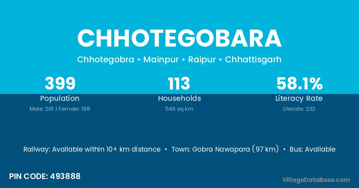 Gobra Nawapara (97 km) is the nearest town to Chhotegobara village for major economic activities and is located approximately 97 km away.