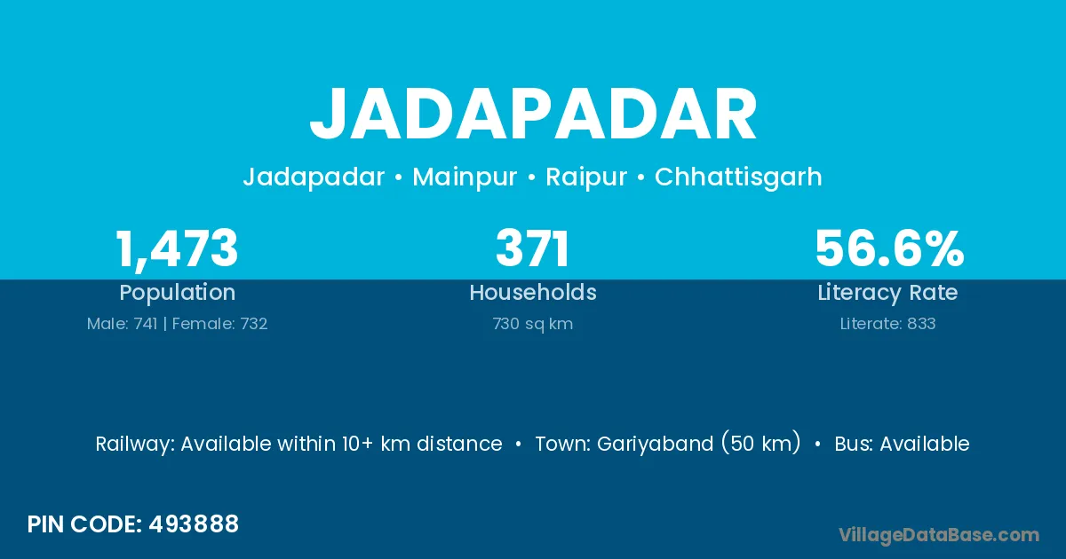 Gariyaband (50 km) is the nearest town to Jadapadar village for major economic activities and is located approximately 50 km away.