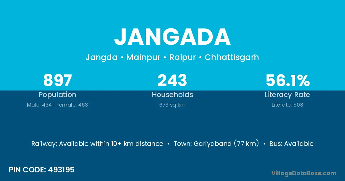 Gariyaband (77 km) is the nearest town to Jangada village for major economic activities and is located approximately 77 km away.