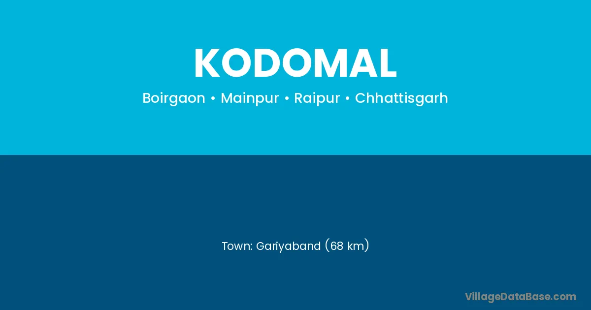 Gariyaband (68 km) is the nearest town to Kodomal village for major economic activities and is located approximately 68 km away.