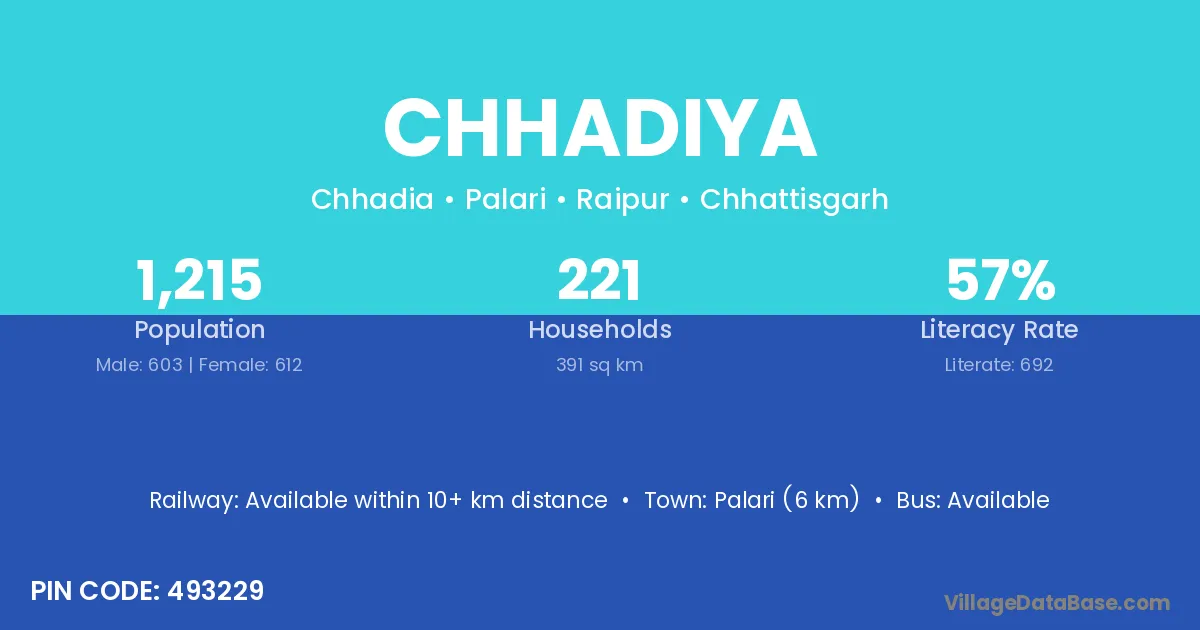 Chhadiya village has a total population of 1,215 people, of which 603 are males and 612 are females.