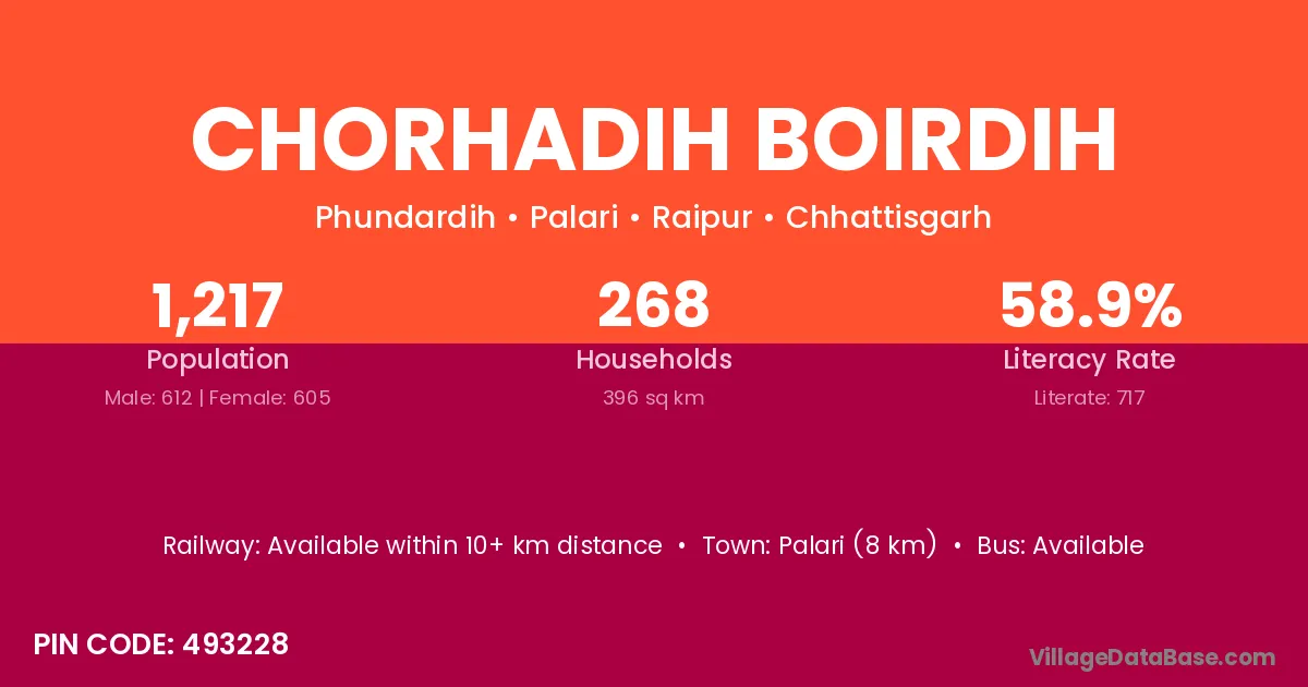 Palari (8 km) is the nearest town to Chorhadih Boirdih village for major economic activities and is located approximately 8 km away.