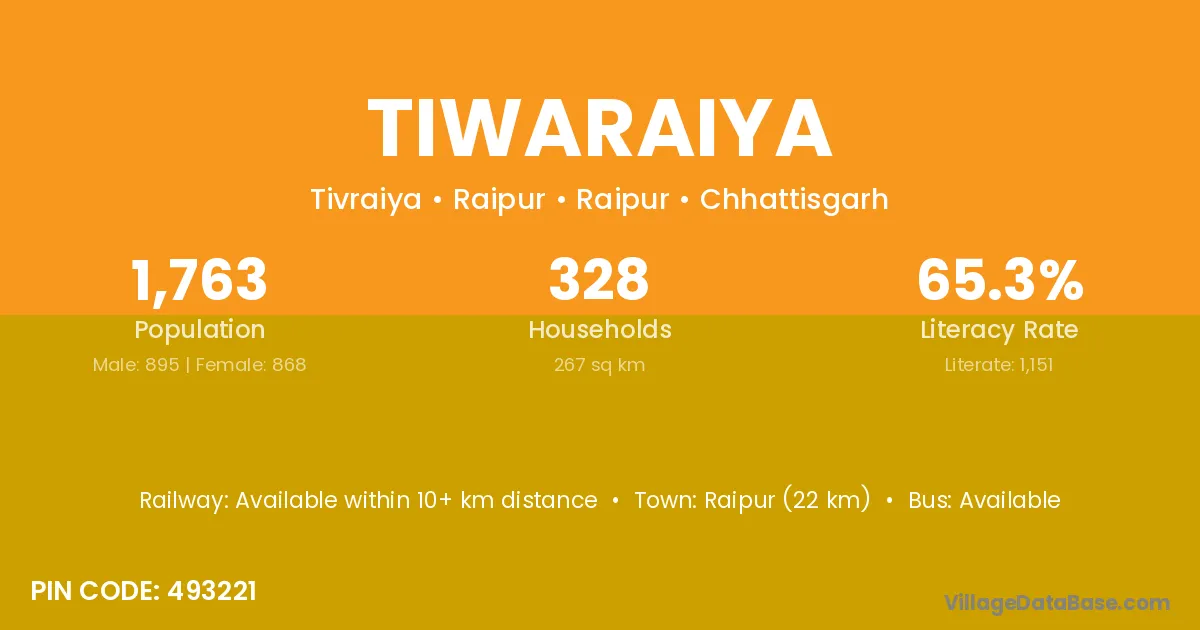 Raipur (22 km) is the nearest town to Tiwaraiya village for major economic activities and is located approximately 22 km away.