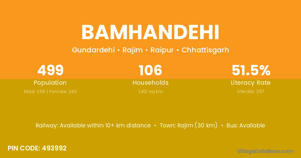 Rajim (30 km) is the nearest town to Bamhandehi village for major economic activities and is located approximately 30 km away.