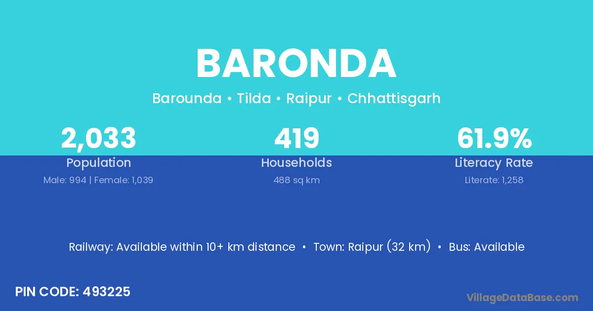 Gobra Nawapara (9 km) is the nearest town to Baronda village for major economic activities and is located approximately 9 km away.