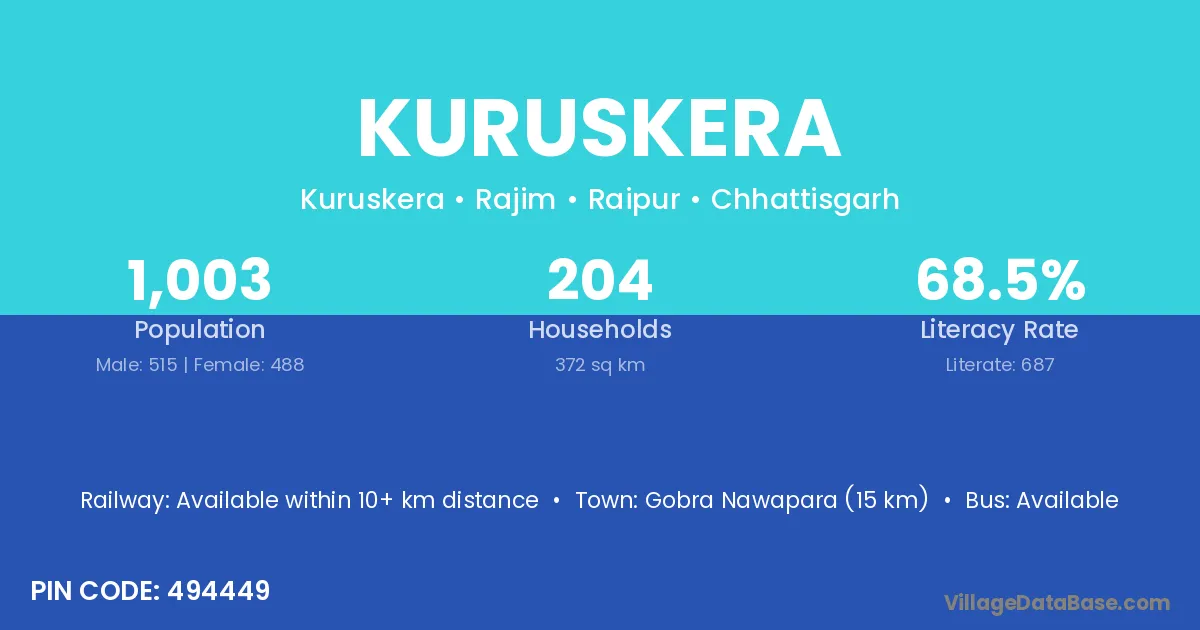Gobra Nawapara (15 km) is the nearest town to Kuruskera village for major economic activities and is located approximately 15 km away.