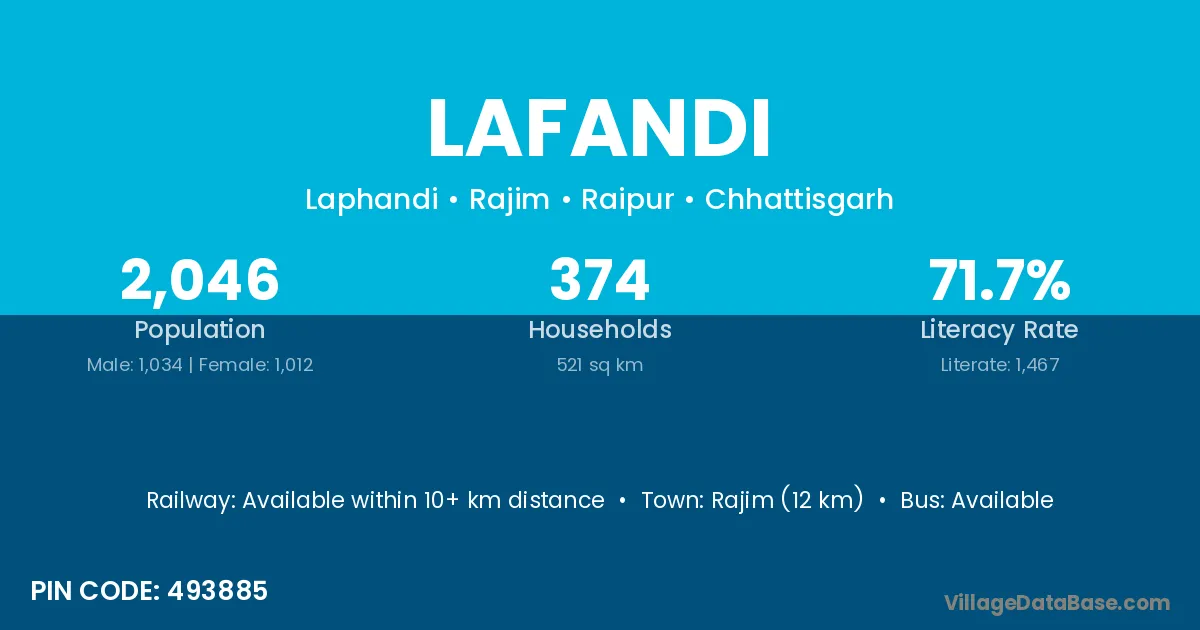 Rajim (12 km) is the nearest town to Lafandi village for major economic activities and is located approximately 12 km away.