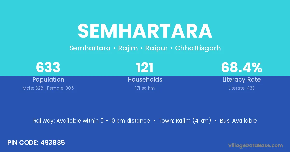 Rajim (4 km) is the nearest town to Semhartara village for major economic activities and is located approximately 4 km away.