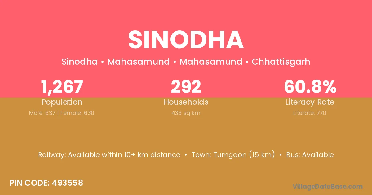 Bhatapara (10 km) is the nearest town to Sinodha village for major economic activities and is located approximately 10 km away.