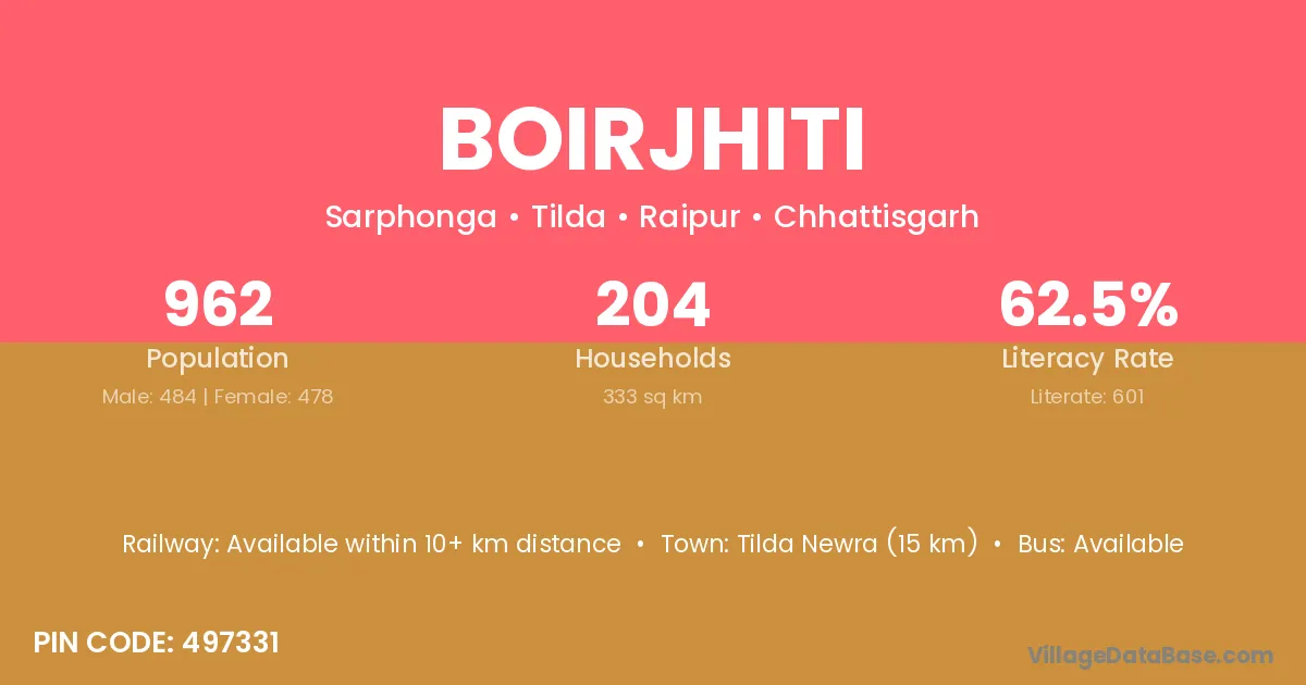 Tilda Newra (15 km) is the nearest town to Boirjhiti village for major economic activities and is located approximately 15 km away.