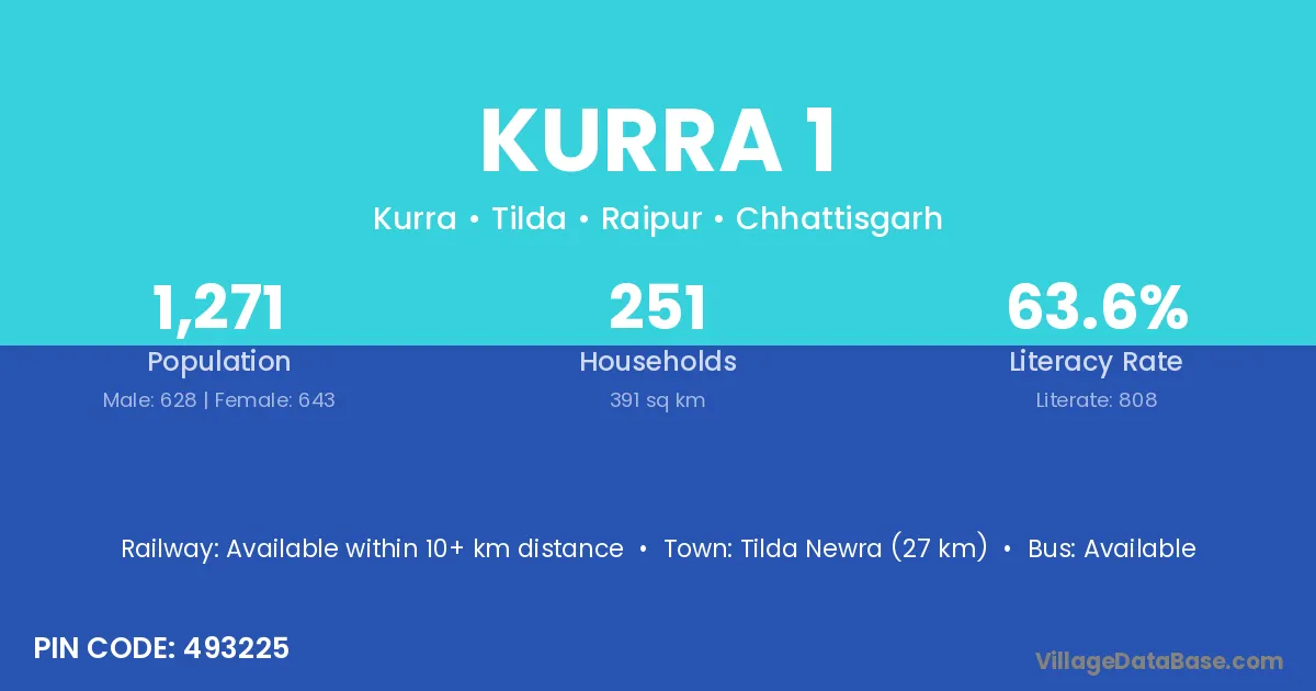 Kurra 1 village has a total population of 1,271 people, of which 628 are males and 643 are females.