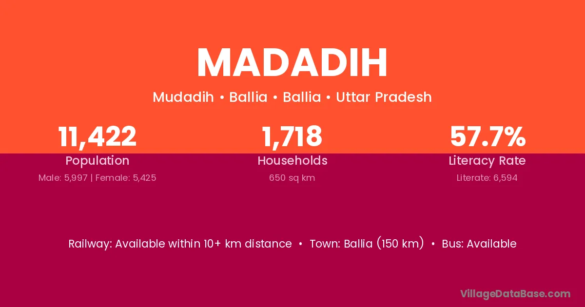 The literacy rate of Madadih village is 66.56%. Male literacy stands at 77.65% and female literacy at 54.13%.