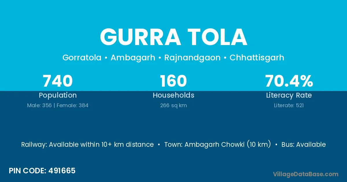 Ambagarh Chowki (10 km) is the nearest town to Gurra Tola village for major economic activities and is located approximately 10 km away.