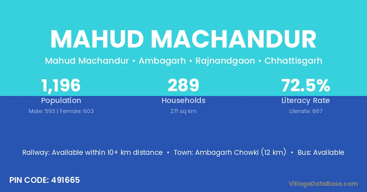 Ambagarh Chowki (12 km) is the nearest town to Mahud Machandur village for major economic activities and is located approximately 12 km away.