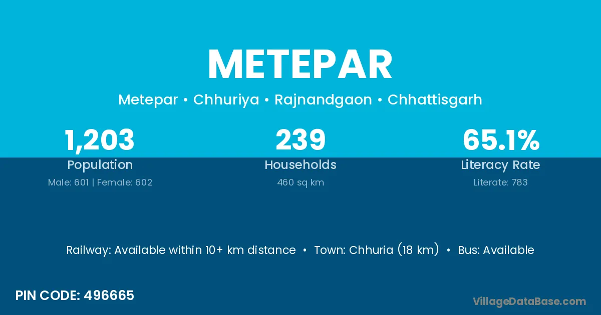 Ambagarh Chowki (4 km) is the nearest town to Metepar village for major economic activities and is located approximately 4 km away.