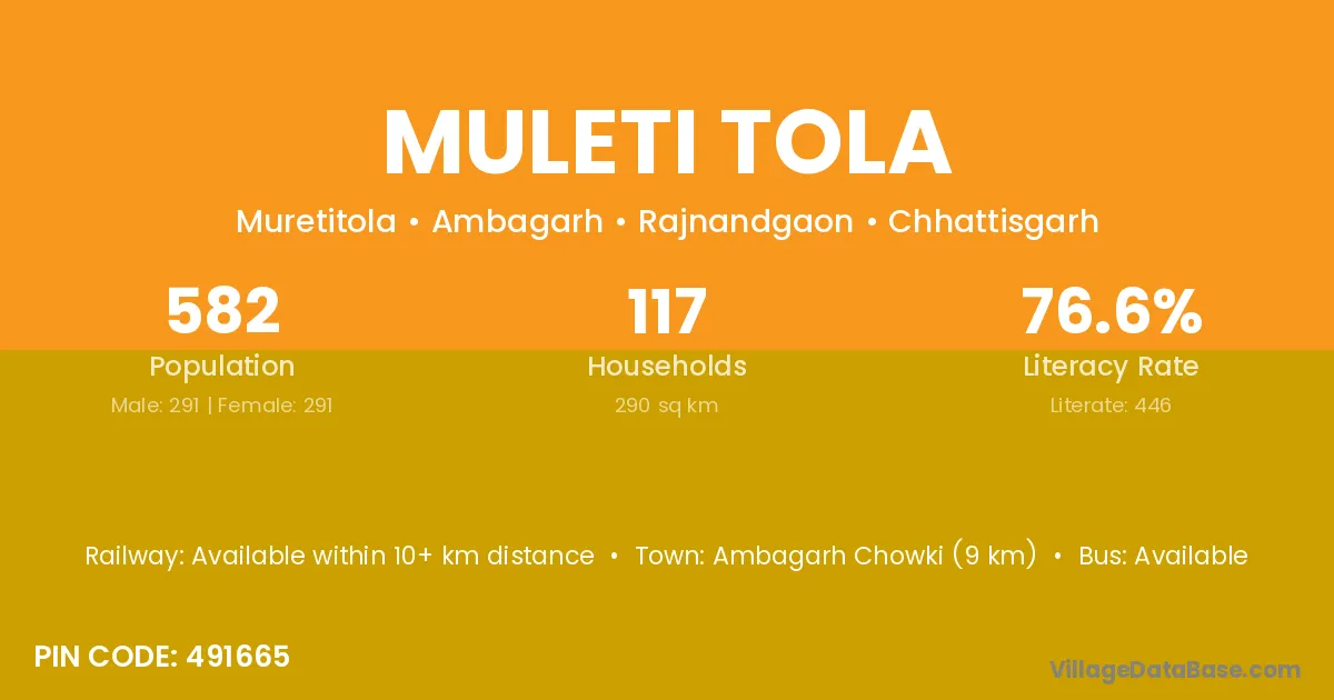 Muleti Tola village has a total population of 582 people, of which 291 are males and 291 are females.