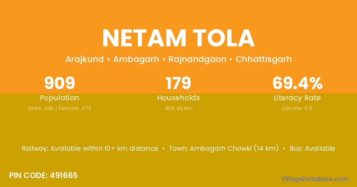 Ambagarh Chowki (14 km) is the nearest town to Netam Tola village for major economic activities and is located approximately 14 km away.