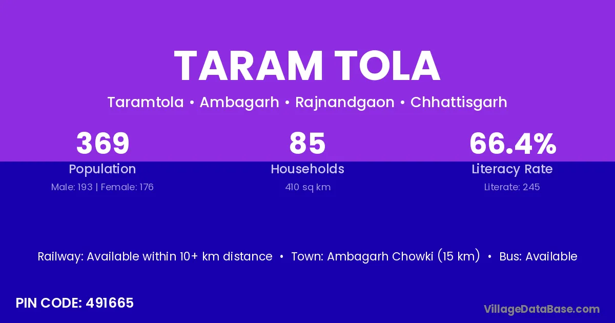 Ambagarh Chowki (15 km) is the nearest town to Taram Tola village for major economic activities and is located approximately 15 km away.
