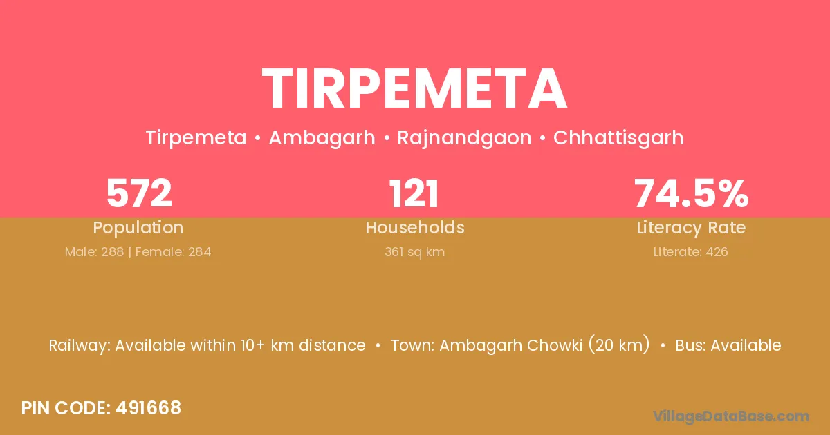 Ambagarh Chowki (20 km) is the nearest town to Tirpemeta village for major economic activities and is located approximately 20 km away.