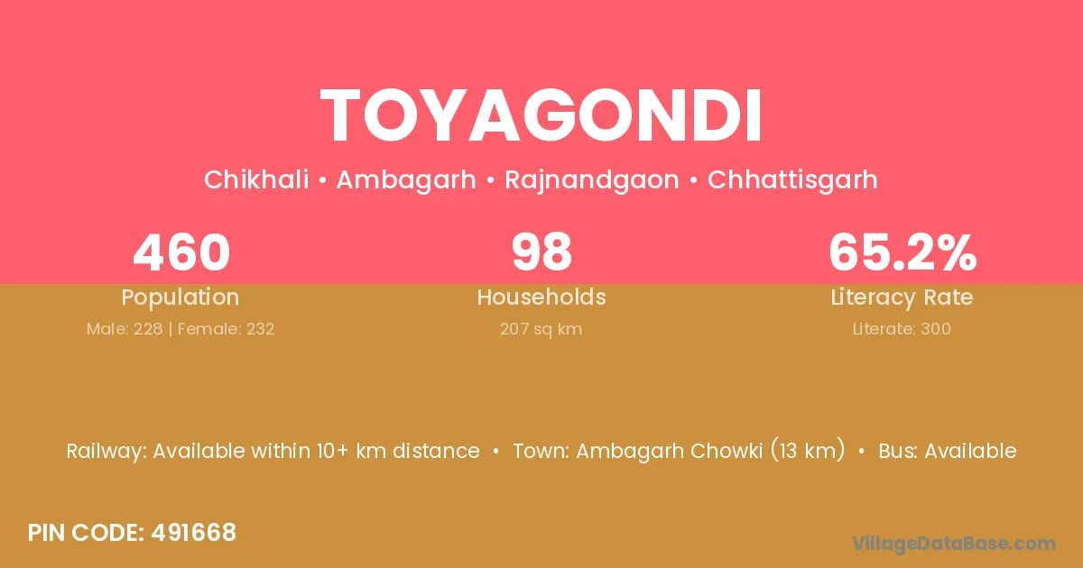 Ambagarh Chowki (13 km) is the nearest town to Toyagondi village for major economic activities and is located approximately 13 km away.