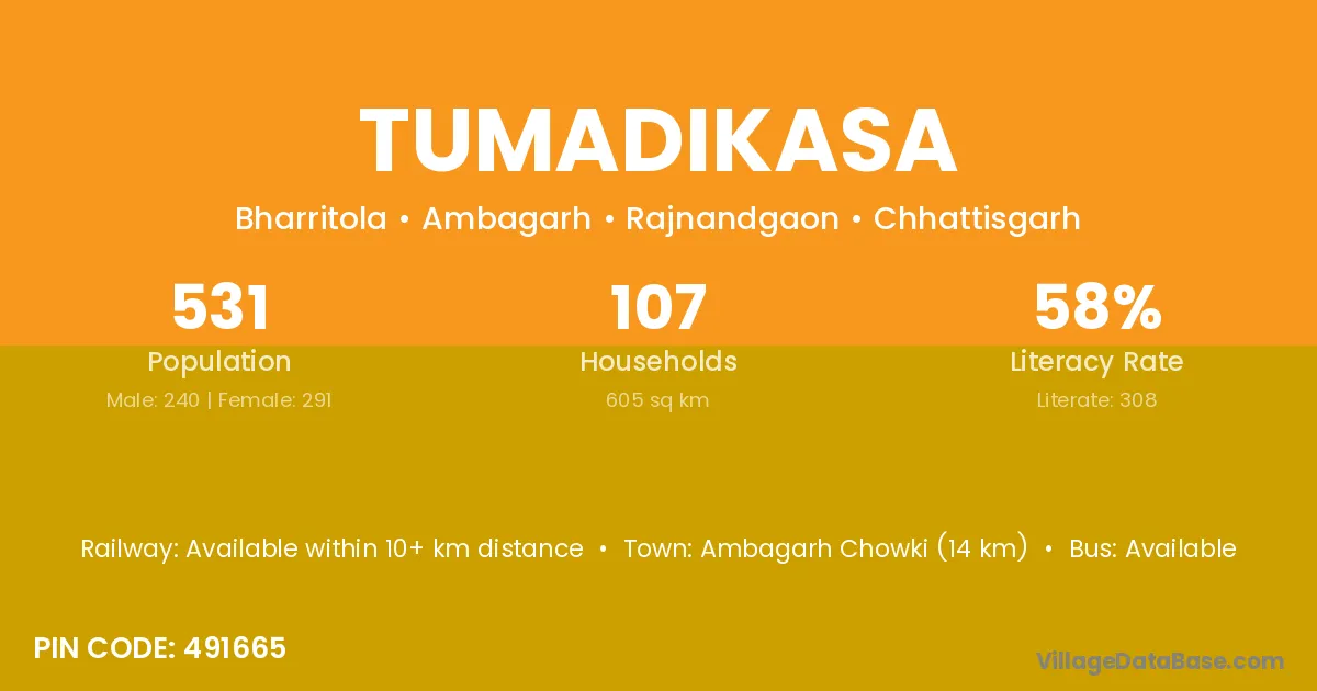 Ambagarh Chowki (14 km) is the nearest town to Tumadikasa village for major economic activities and is located approximately 14 km away.