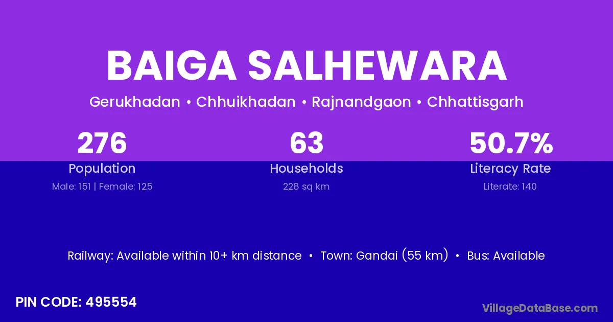 Gandai (55 km) is the nearest town to Baiga Salhewara village for major economic activities and is located approximately 55 km away.