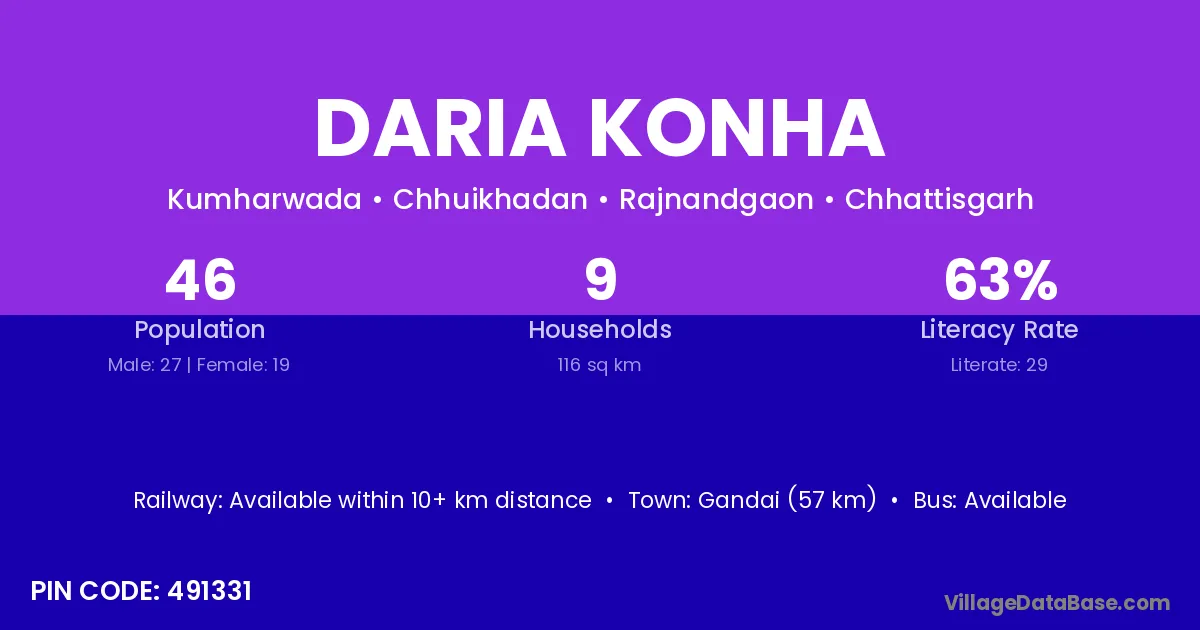 Gandai (57 km) is the nearest town to Daria Konha village for major economic activities and is located approximately 57 km away.