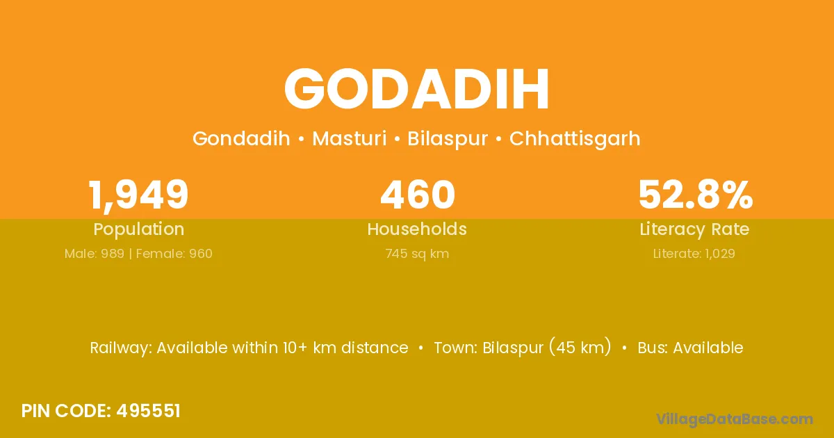 Khairagarh (12 km) is the nearest town to Godadih village for major economic activities and is located approximately 12 km away.