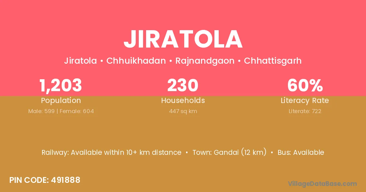 According to Census 2011 information, the village code of Jiratola village is 491888.