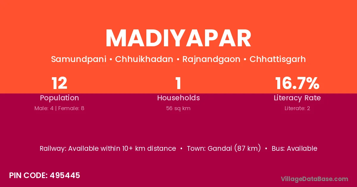 Madiyapar village has a total population of 12 people, of which 4 are males and 8 are females.