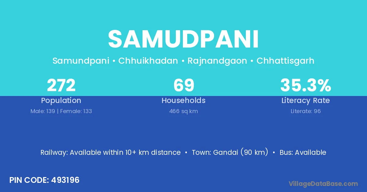 Gandai (90 km) is the nearest town to Samudpani village for major economic activities and is located approximately 90 km away.