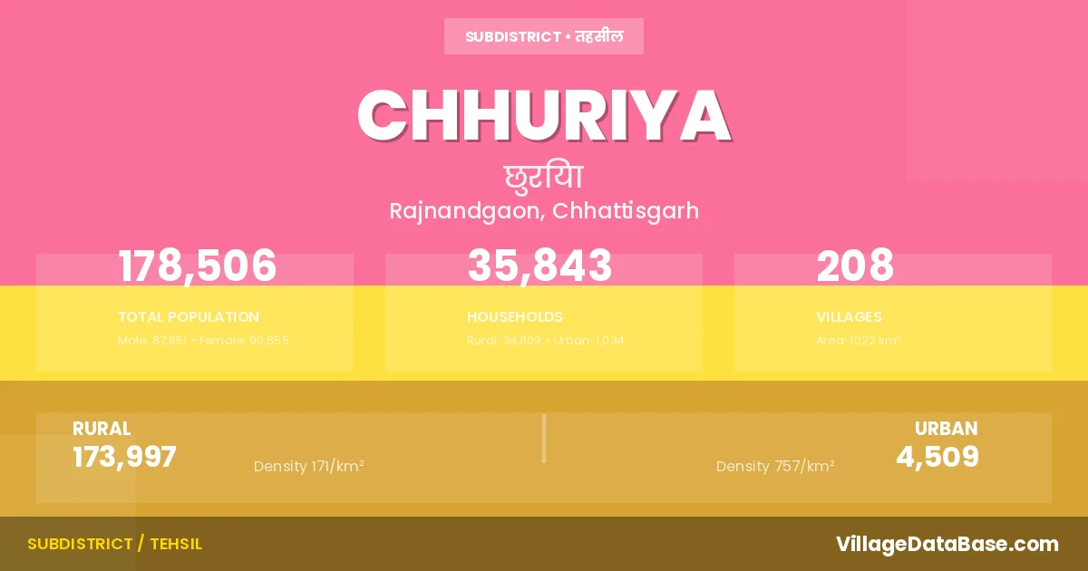 According to the 2011 census The total area of Chhuriya Tehsil is 1022 km², with a population of 178506 people. The population density is 175 inhabitants per square kilometre, and there are approximately 35843 houses in the sub district.