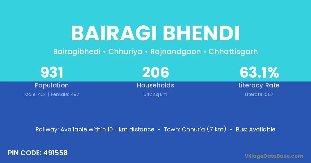 According to Census 2011 information, the village code of Bairagi Bhendi village is 491558.