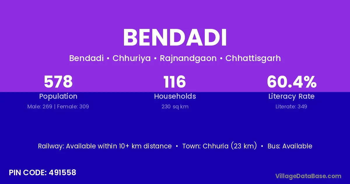 Bendadi village is located in the Chhuriya Tehsil of the Rajnandgaon district in Chhattisgarh .