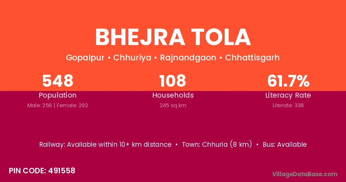 Chhuria (8 km) is the nearest town to Bhejra Tola village for major economic activities and is located approximately 8 km away.