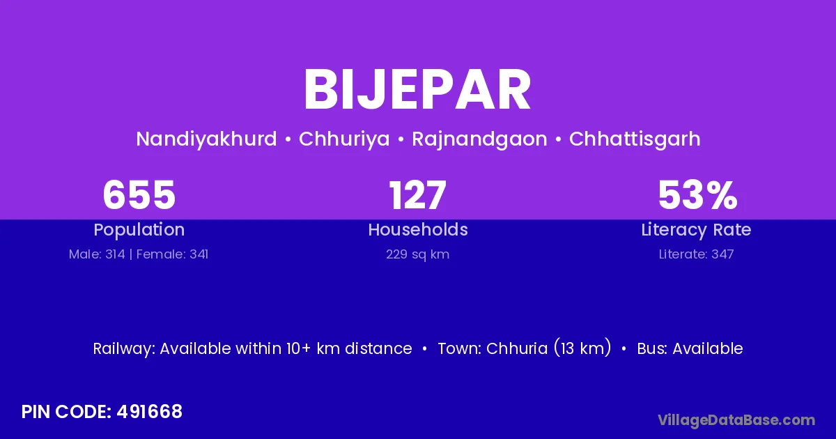 Chhuria (13 km) is the nearest town to Bijepar village for major economic activities and is located approximately 13 km away.