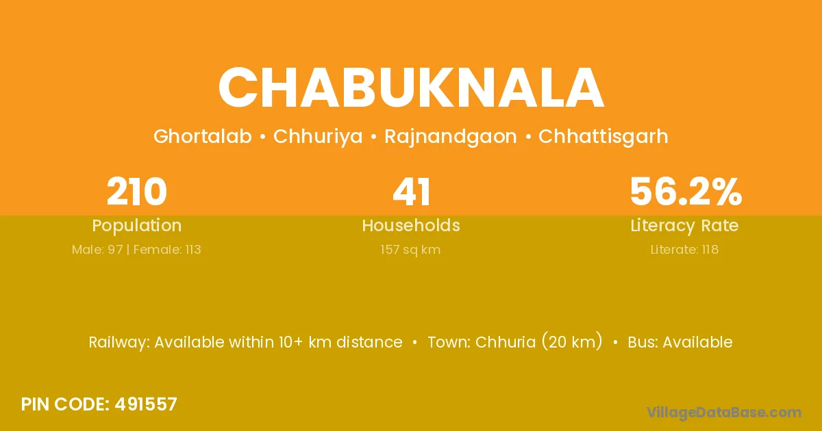 Chabuknala village has a total population of 210 people, of which 97 are males and 113 are females.