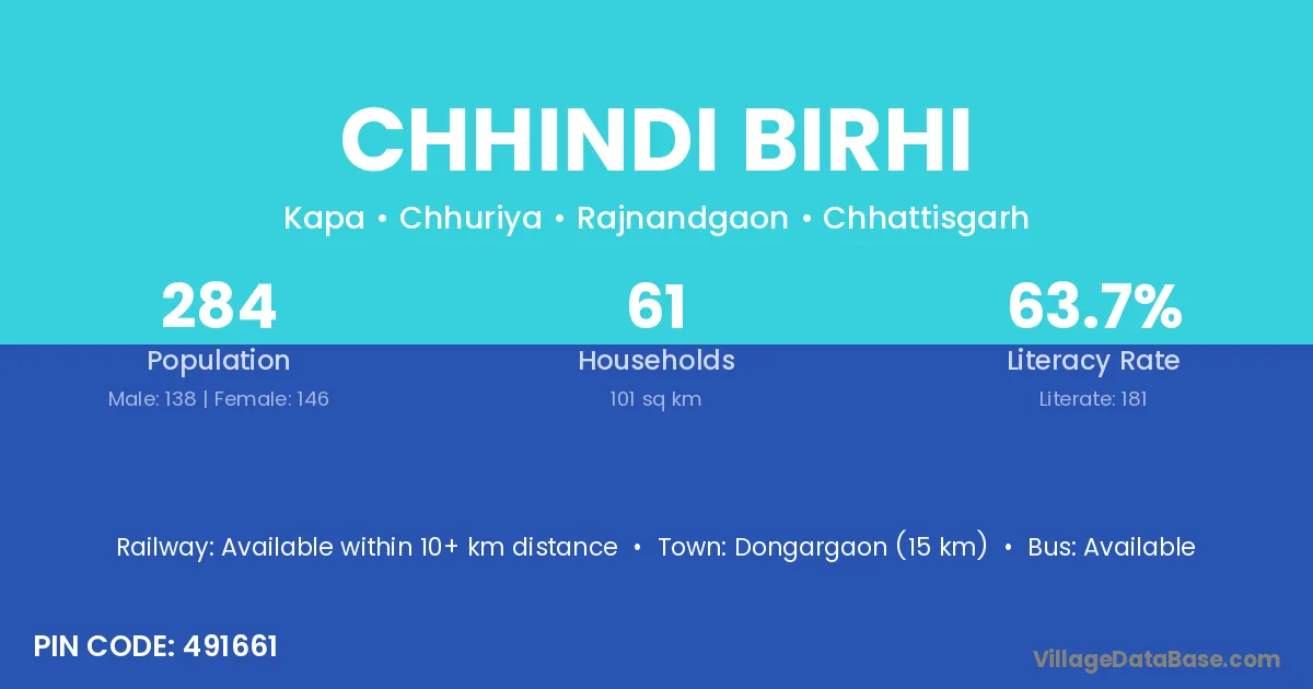Dongargaon (15 km) is the nearest town to Chhindi Birhi village for major economic activities and is located approximately 15 km away.