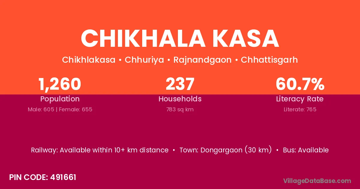 Dongargaon (30 km) is the nearest town to Chikhala Kasa village for major economic activities and is located approximately 30 km away.