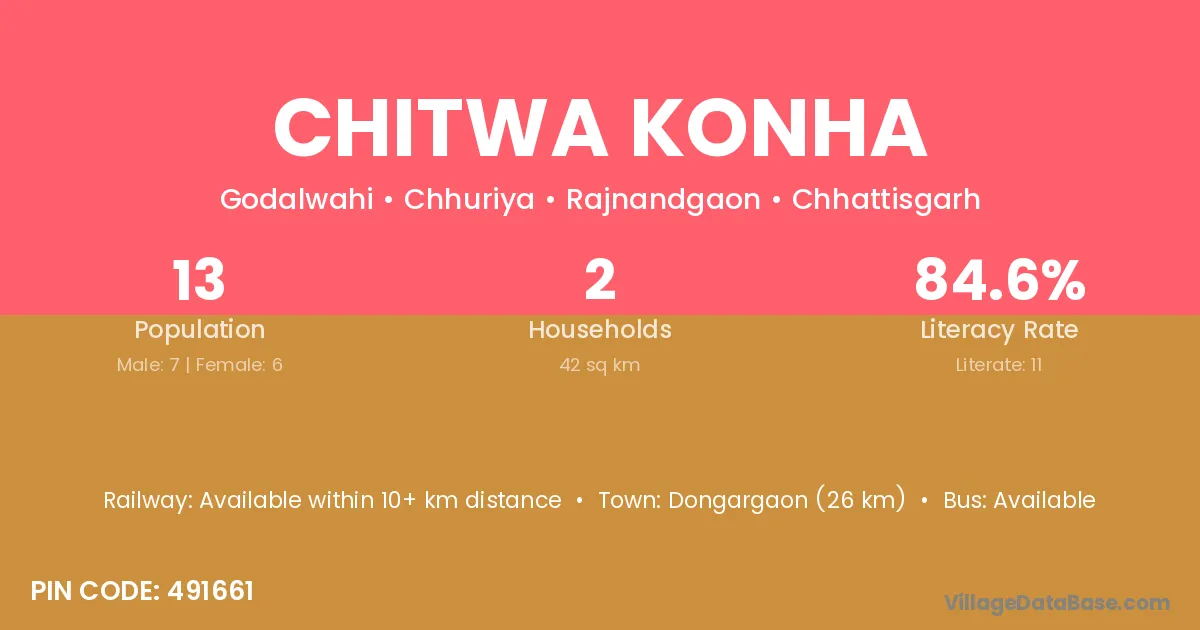 Dongargaon (26 km) is the nearest town to Chitwa Konha village for major economic activities and is located approximately 26 km away.