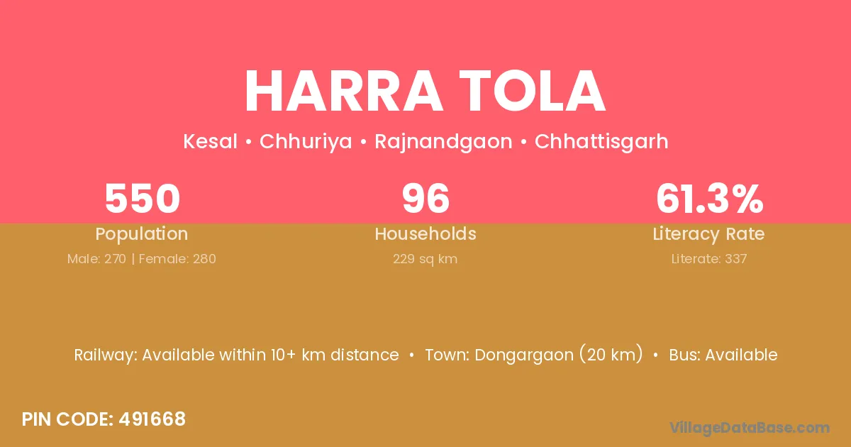 Dongargaon (20 km) is the nearest town to Harra Tola village for major economic activities and is located approximately 20 km away.